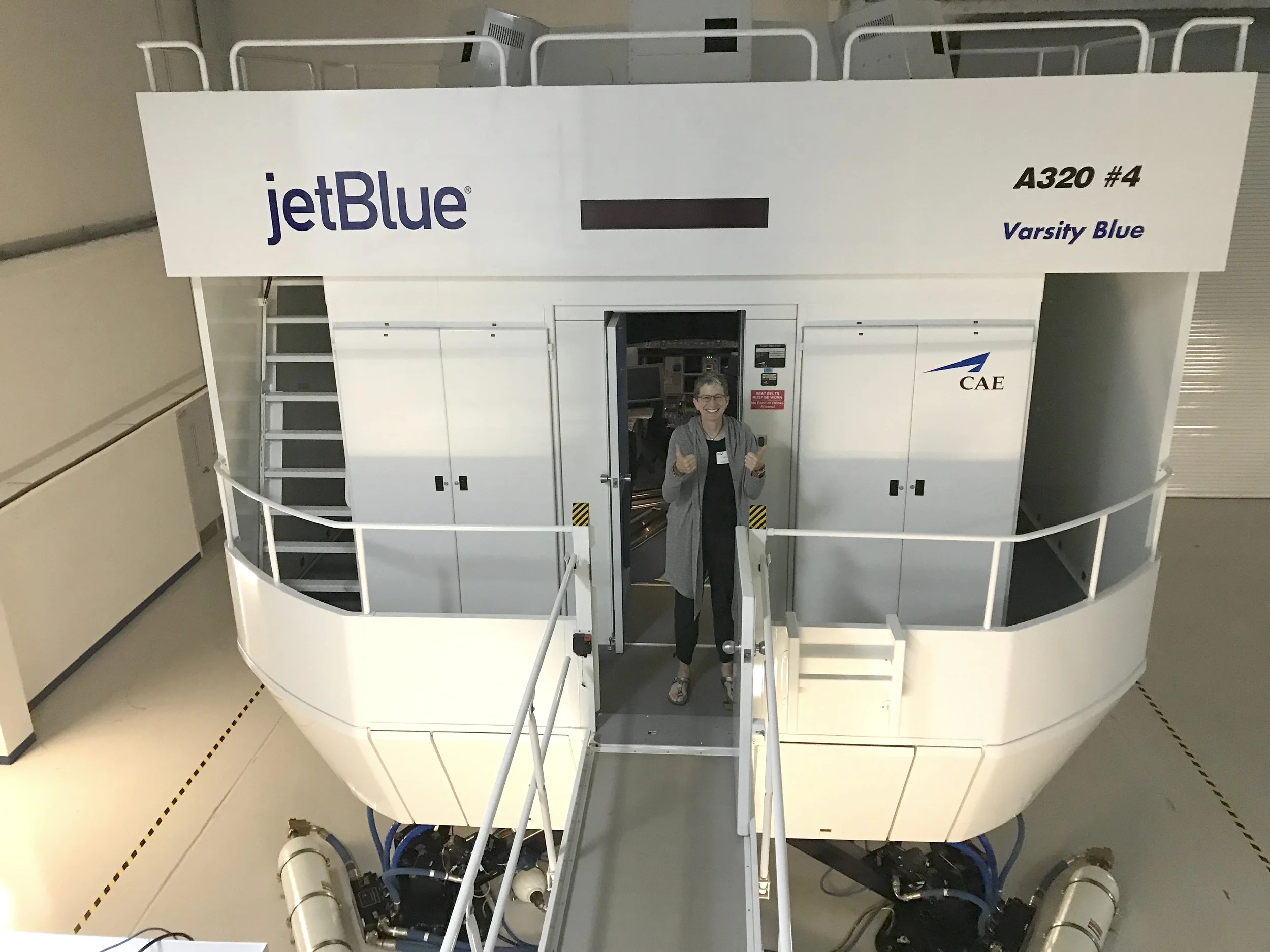 We got to the gorgeous Jet Blue facility around 9PM, and headed up to the sim -- a pod that looks like something out of Star Wars.